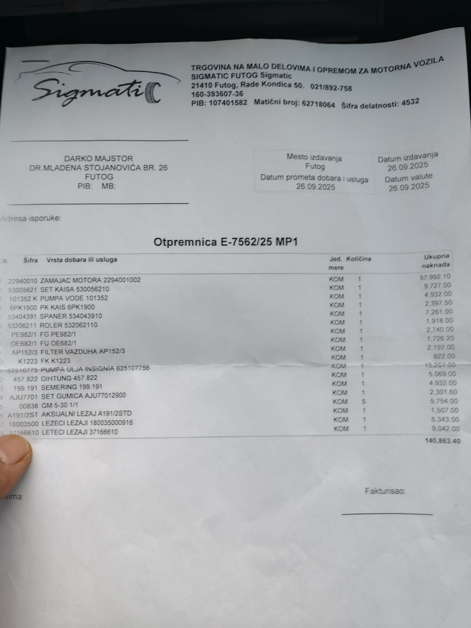 - Na ime kupca Ne