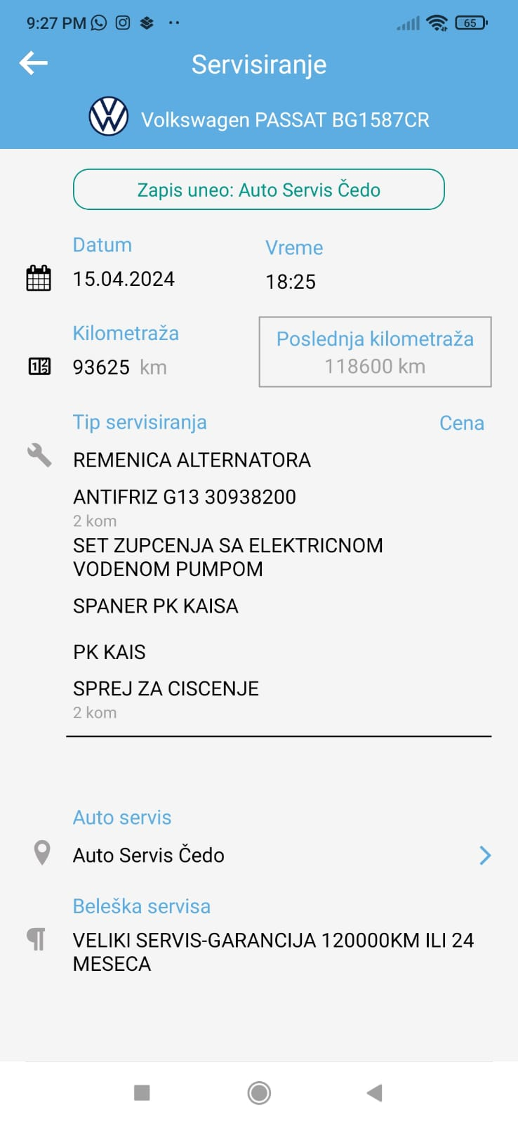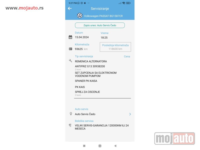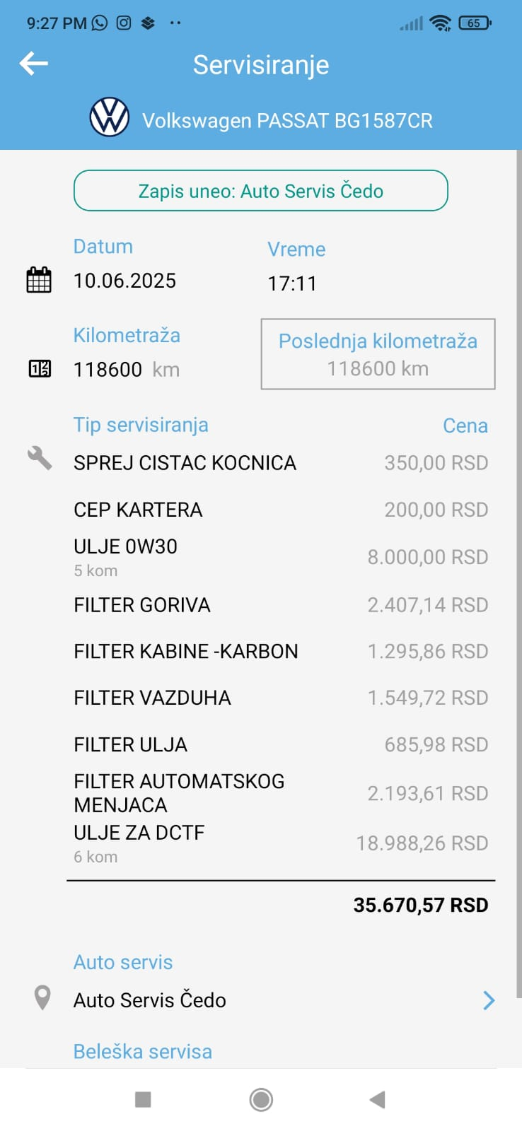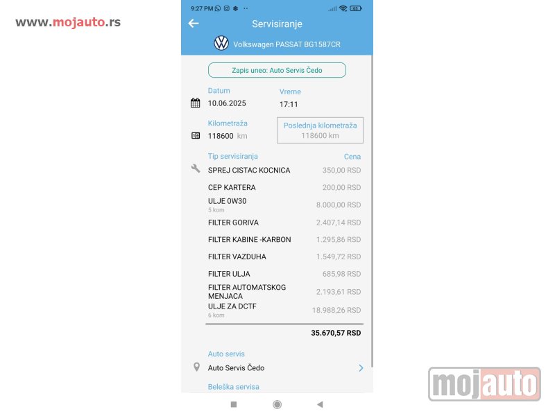 Urađen veliki servis i servis DSG menjača (ispiranje, zamena ulja i filtera).