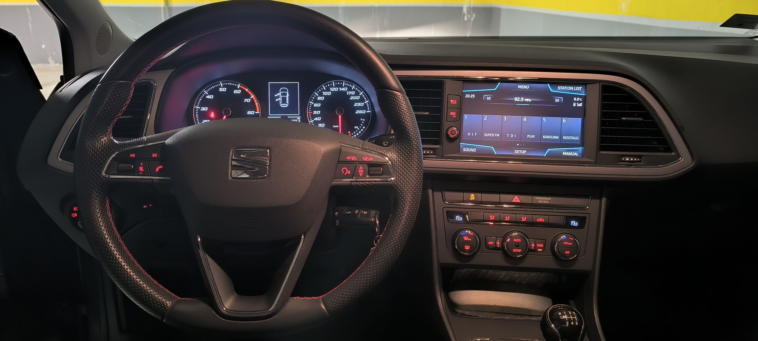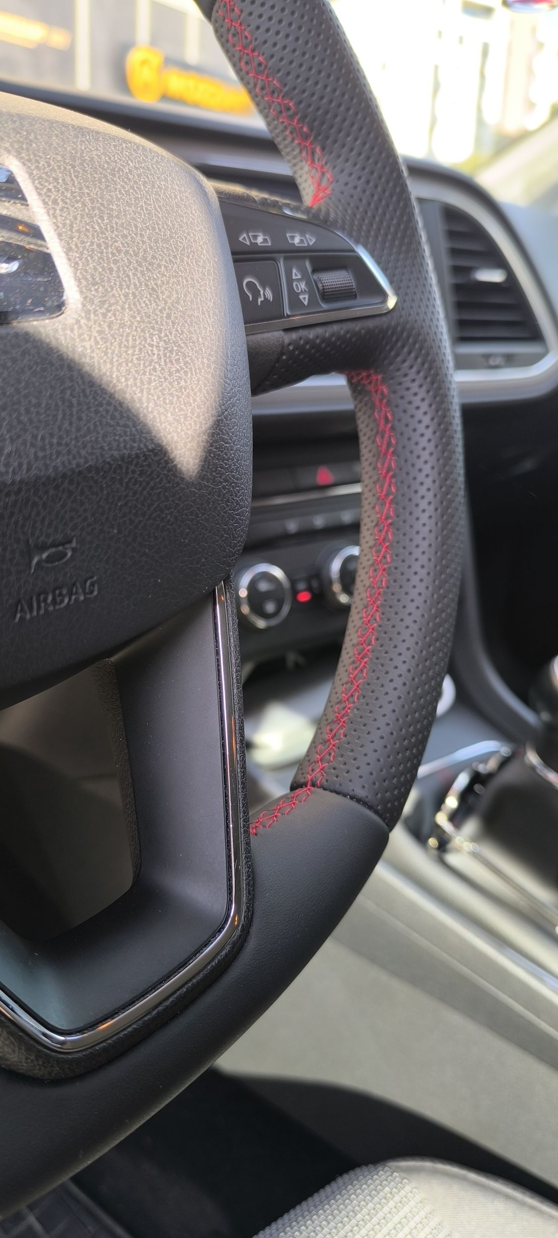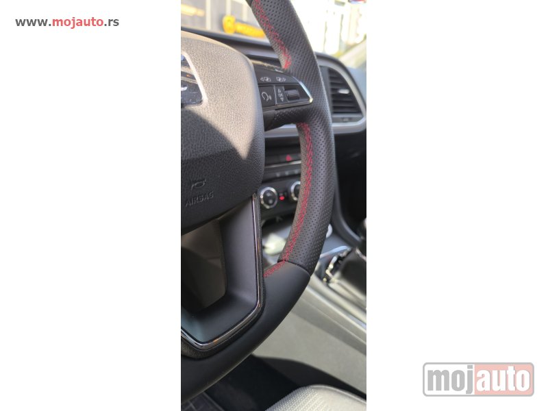 - Volan i koza ispod menjaca presvuceni u kombinaciju perforirane i obicne koze sa crvenim štepom .