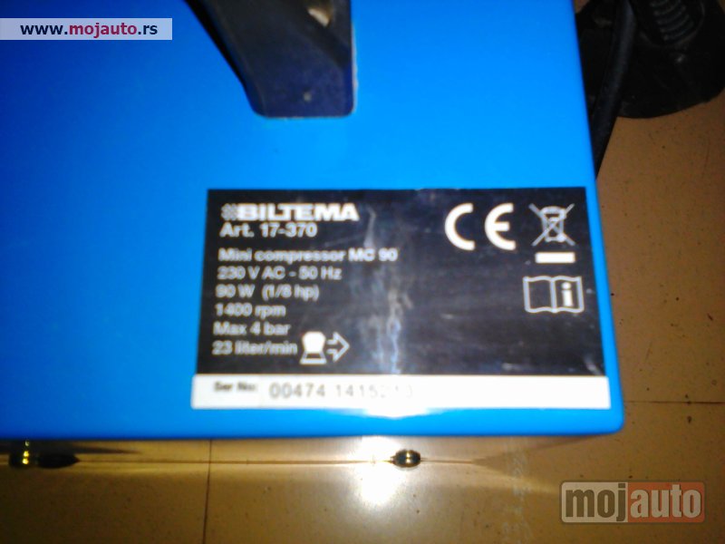 Mali kompresor Biltema MC 90, kupljen u Švedskoj, NOV - NIKAD UPOTREBLJEN. Tehničke specifikacije su na poslednjoj slici, za ostale informacije pozvati.