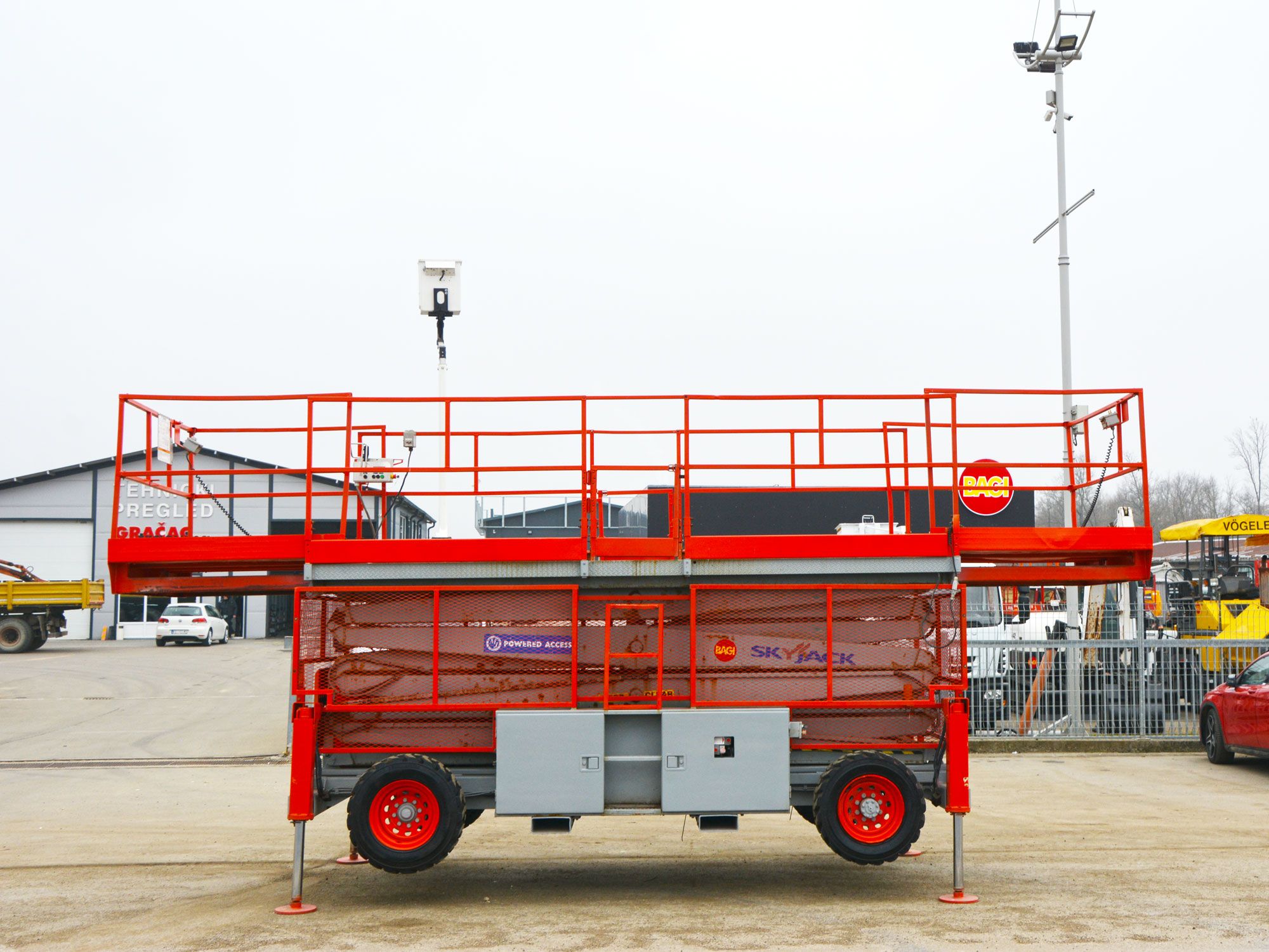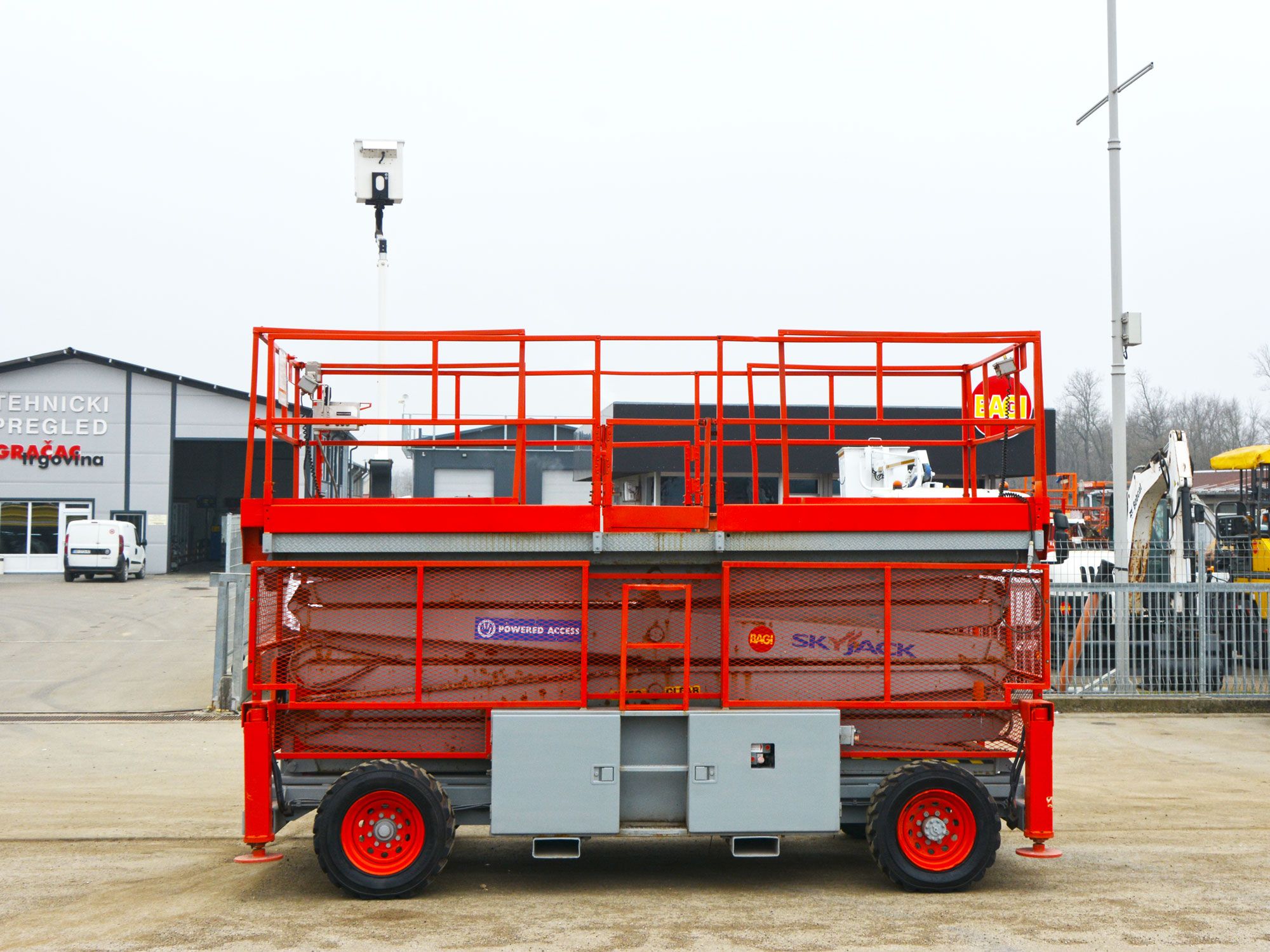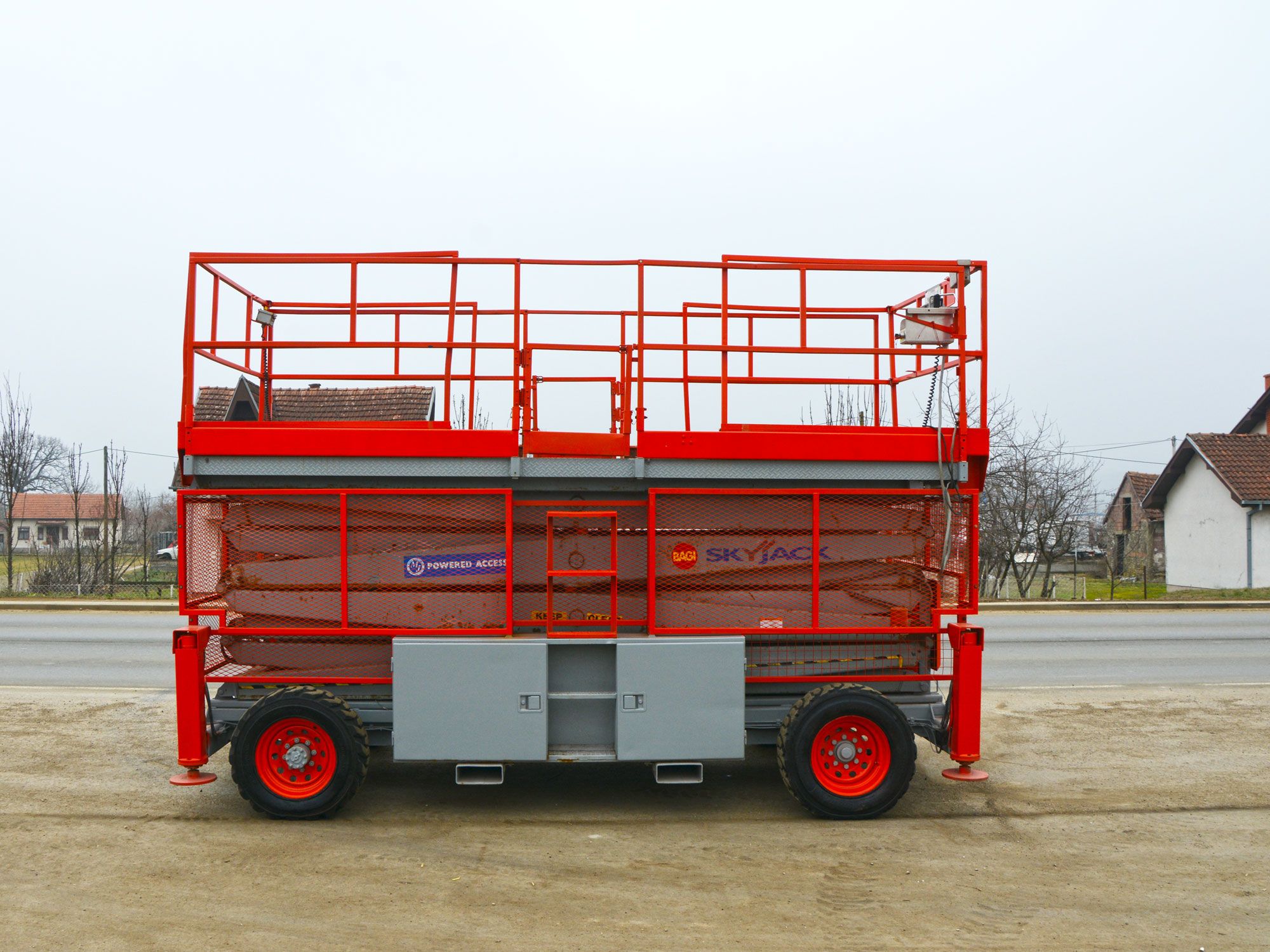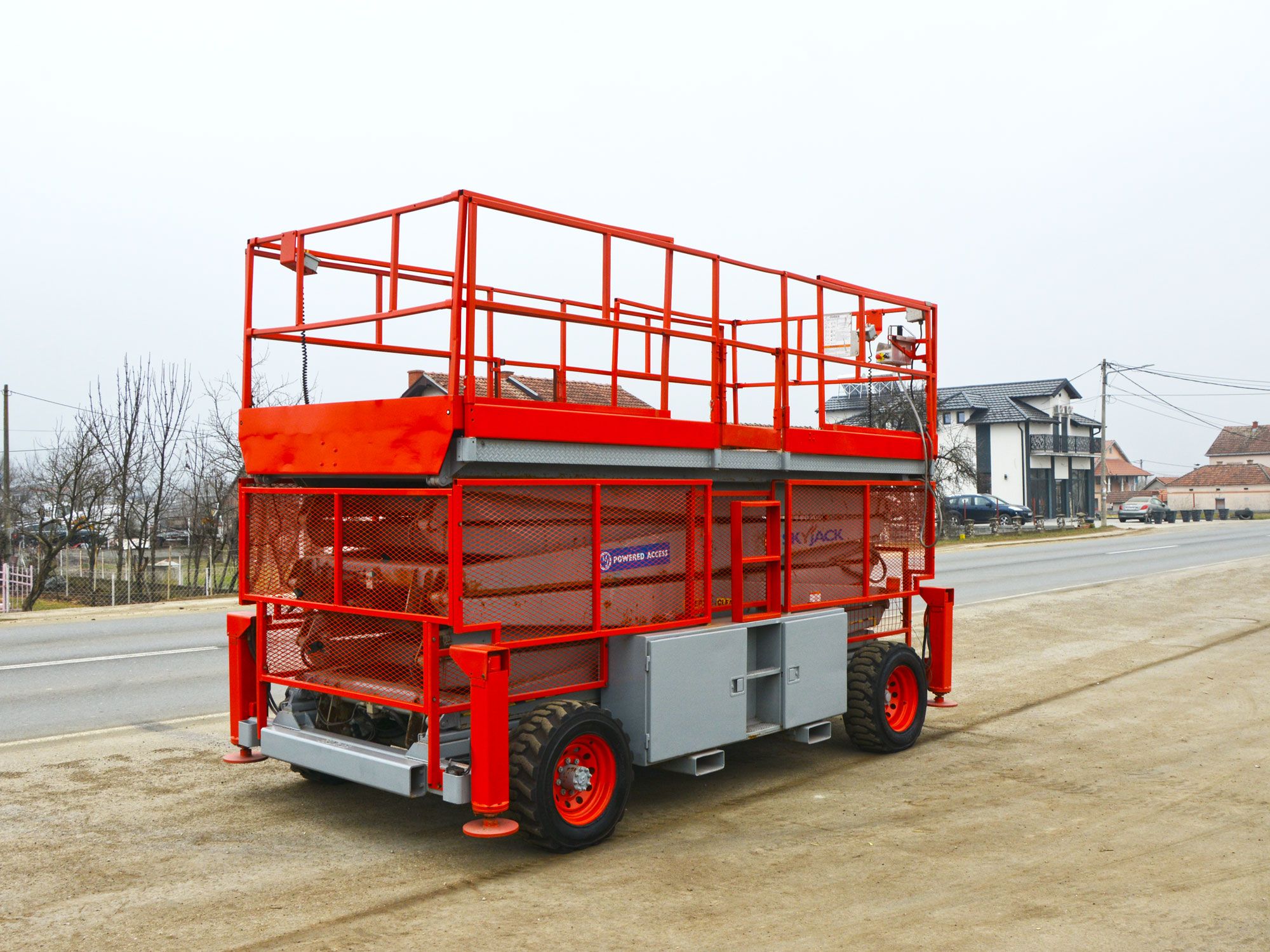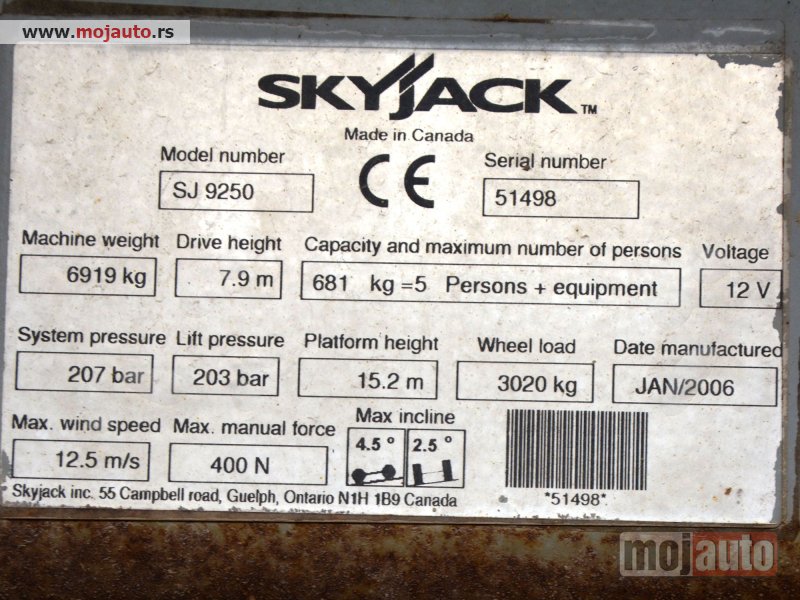 2006 GOD. SKYJACK SJ9250 SAMOHODNA MAKAZASTA PLATFORMA ZA RAD NA VISINI, 4X4, MOTOR KUBOTA 3 CILINDRA, 27KS, VODENO HLAĐENJE, 2478 RADNIH SATI, RADNA VISINA JE 17,5 METARA, NOSIVOST PLATFORME 681KG. PLATFORMA SE PRODUŽUJE SA OBE STRANE, DUŽINA PLATFORME JE 4,50M, A UKUPNA DUŽINA SA PRODUŽENIM STRANAMA JE 6,02M, INSTALACIJA 220V U PLATFORMI, ALARM ZA NAGIB I PREOPTEREĆENJE PLATFORME, AUTOMATSKA NIVELACIJA KORPE, MOGUĆNOST POJEDINAČNE NIVELACIJE STOPA, TRANSPORTNI USPON PLATFORME 35 STEPENI, GUME PUNJENE SILIKONOM.